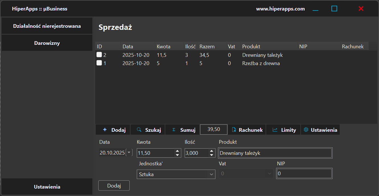 Aplikacja ułatwiająca prowadzenie działalności nierejestrowanej. Program pozwala również na ewidencje wpłat będących darowiznami.